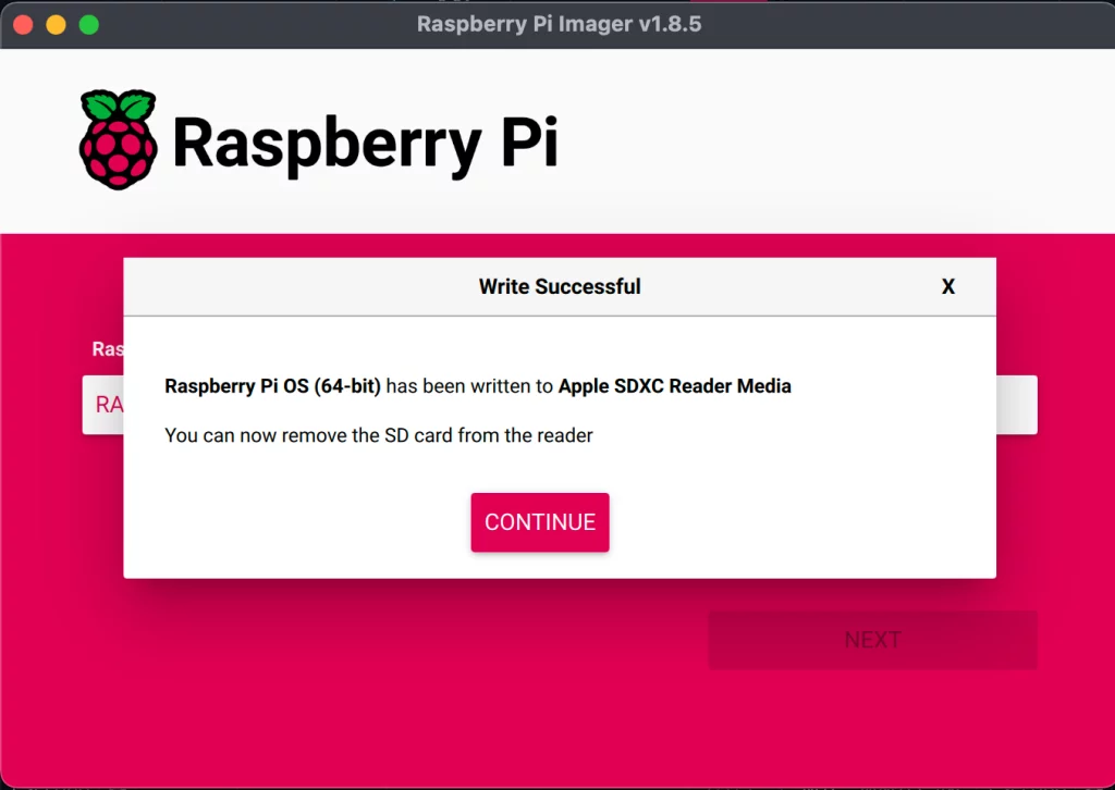 เมื่อ Raspberry Pi Imager ทำการตรวจสอบไฟล์เสร็จก็จะเป็นการเสร็จสิ้น ให้กด continue