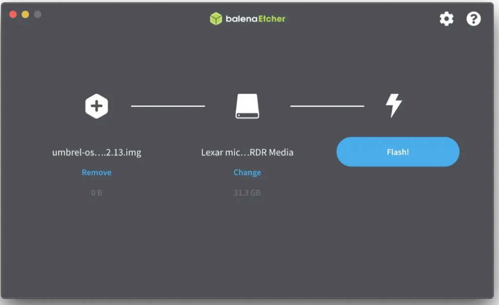 ขั้นตอนต่อไปคือการ Flash MicroSD Card ด้วย UmbrelOS zip file ที่ดาวโหลดไว้ โดยใช้โปรแกรม Balena Etcher