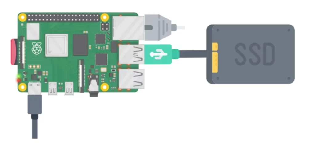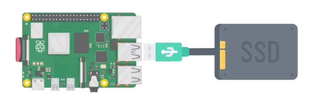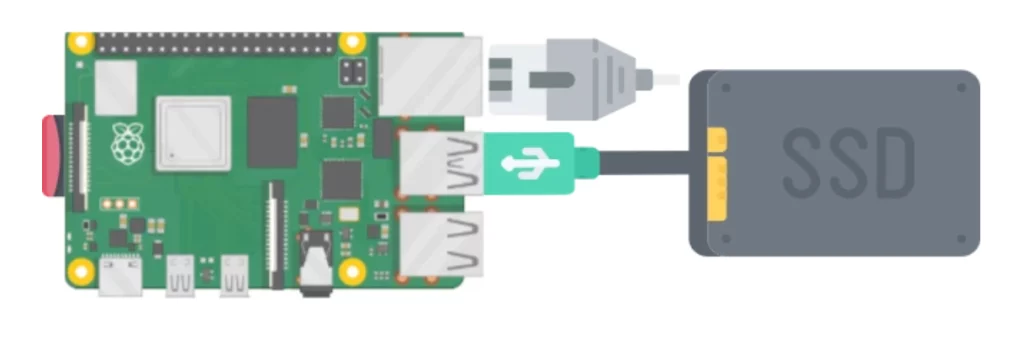 ขั้นตอนต่อไปให้เชื่อมต่อ SSD Storage ที่เตรียมไว้ไปที่ USB 3.0 Port ( สีฟ้า ) ของ Raspberry Pi